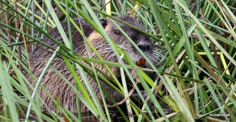 Le ragondin ne s'y trompe pas. Tenant une tige entre ses pattes avant, ses longues incisives rouge orange grignotent sans cesse. Il déguste les tendres parties blanches des scirpes, dédaignant les parties vertes plus dures qui, peu à peu, s'accumulent en un vaste désordre.